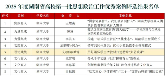 近日,根据《关于开展2025年度湖南省高校思想政治工作优秀案例征集与宣传活动的通知》要求,经各高校推荐、资格审核、专家评审,我院辅导员老师艾克帕尔·吐地负责的《用好退伍学生活教材打造特殊“大思政课”》获评2025年度湖南省高校第一批思想政治工作优秀案例。